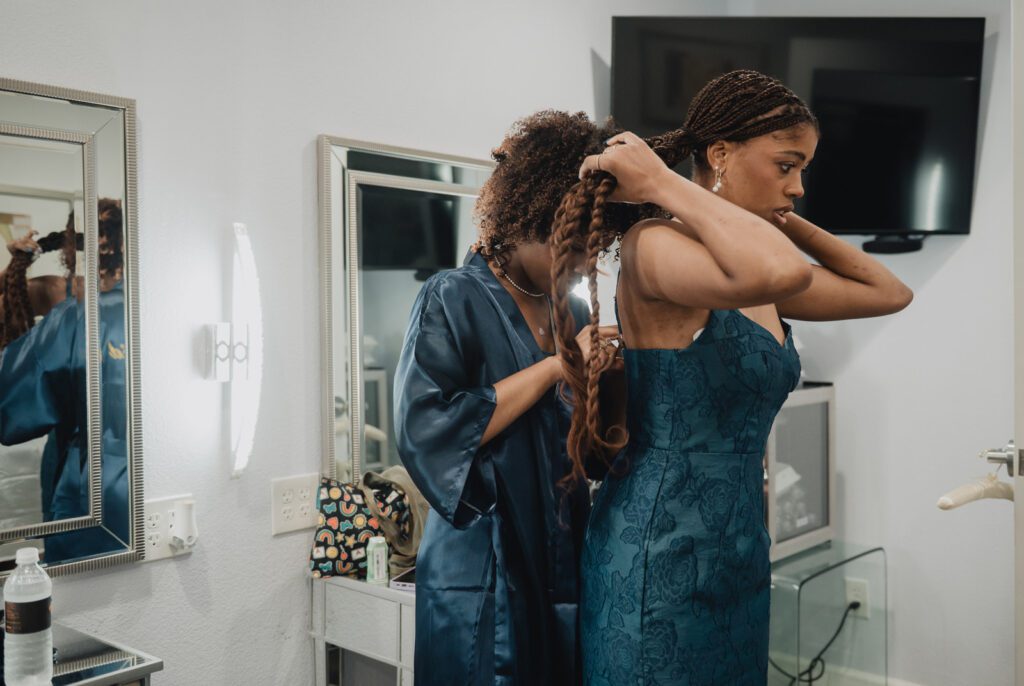 One of the biggest timeline misunderstandings we see is this: being finished with hair and makeup does not mean you’re ready to walk out the door.